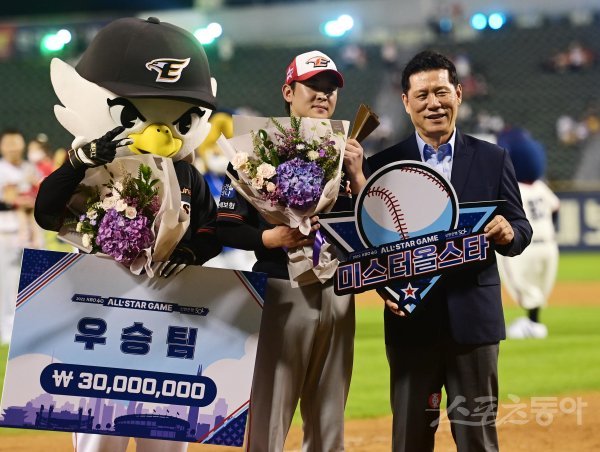 16일 서울 잠실야구장에서 열린 ‘2022 KBO 올스타전’ 드림 올스타와 나눔 올스타의 경기에서 미스터 올스타로 선정된 나눔올스타 정은원이 허구연 총재와 기념 촬영을 하고 있다.