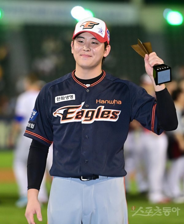 16일 서울 잠실야구장에서 열린 ‘2022 KBO 올스타전’ 드림 올스타와 나눔 올스타의 경기에서 미스터 올스타로 선정된 나눔올스타 정은원이 기념 촬영을 하고 있다.