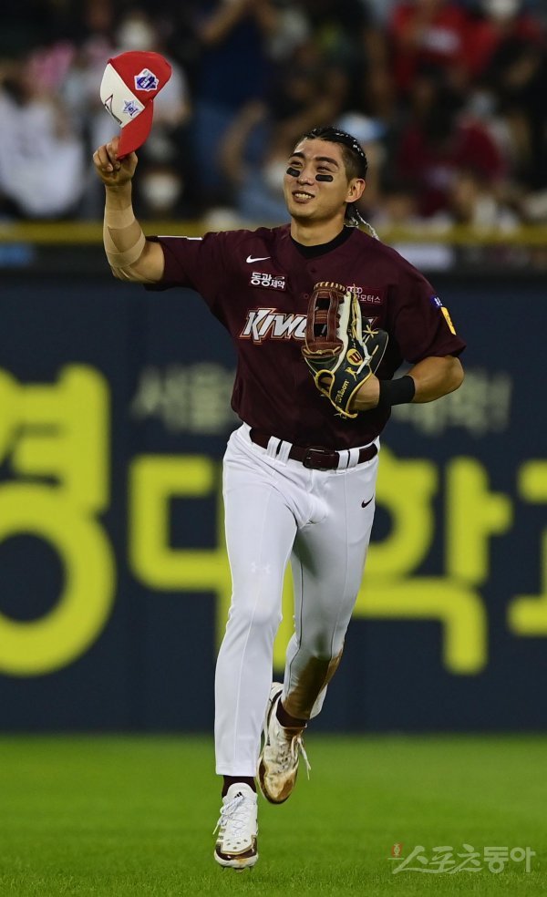 16일 서울 잠실야구장에서 열린 ‘2022 KBO 올스타전’ 드림 올스타와 나눔 올스타의 경기에서 1회말 2사 1, 3루 드림올스타의 타구를 잡은 나눔올스타 이정후가 모자를 벗어 팬들에게 인사하고 있다.