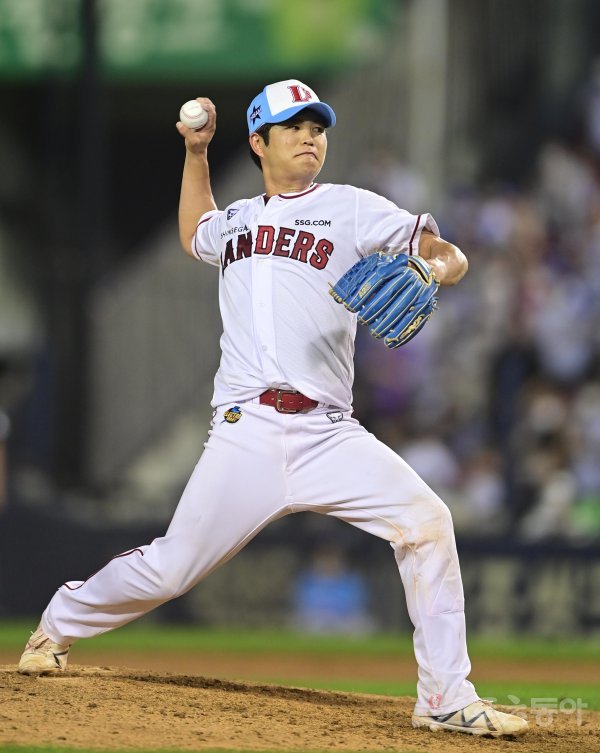 16일 서울 잠실야구장에서 열린 ‘2022 KBO 올스타전’ 드림 올스타와 나눔 올스타의 경기에서 연장 10회초 승부치기 때 드림올스타 김민식이 교체로 마운드에 올라 역투하고 있다.
