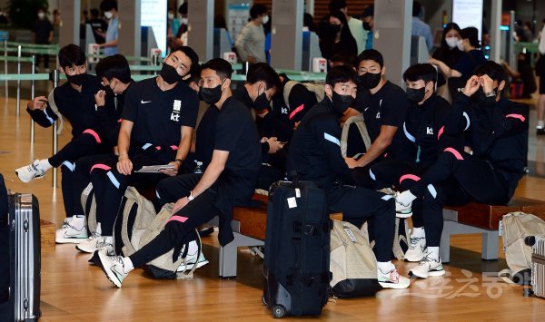 2022 EAFF E-1 챔피언십에 출전하는 한국 축구국가대표팀이 17일 인천국제공항을 통해 일본으로 출국했다. 축구대표팀 선수들이 출국에 앞서 이야기를 나누고 있다.