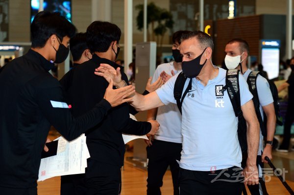2022 EAFF E-1 챔피언십에 출전하는 한국 축구국가대표팀이 17일 인천국제공항을 통해 일본으로 출국했다. 축구대표팀 벤투 감독이 출국에 앞서 선수들과 인사를 나누고 있다.