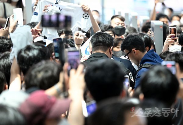 프리시즌 한국 투어를 마친 잉글랜드 프로축구(EPL) 토트넘이 17일 인천국제공항을 통해 영국으로 출국했다. 토트넘 손흥민이 출국에 앞서 팬들에게 사인을 하고 있다.