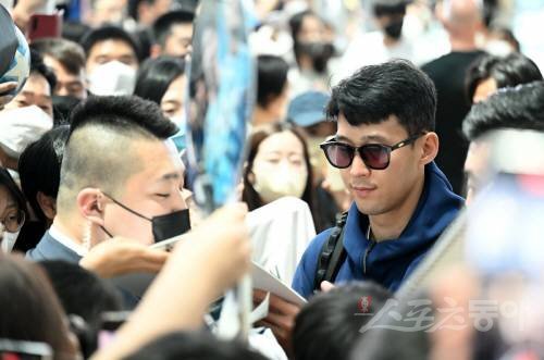 프리시즌 한국 투어를 마친 잉글랜드 프로축구(EPL) 토트넘이 17일 인천국제공항을 통해 영국으로 출국했다. 토트넘 손흥민이 출국에 앞서 팬들에게 사인을 하고 있다.