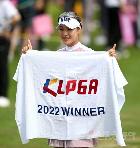 17일 경기도 양주 레이크우드CC에서 열린 KLPGA투어 ‘에버콜라겐 퀸즈 크라운 2022’ 최종라운드에서 합계 20언더파 268타로 우승을 차지한 윤이나가 기념촬영을 하고 있다.