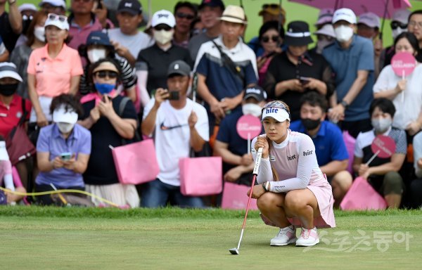 17일 경기도 양주 레이크우드CC에서 열린 KLPGA투어 ‘에버콜라겐 퀸즈 크라운 2022’ 최종라운드에서 윤이나가 퍼팅 라인을 보고 있다.