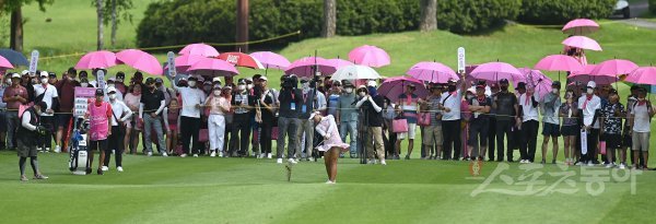 17일 경기도 양주 레이크우드CC에서 열린 KLPGA투어 ‘에버콜라겐 퀸즈 크라운 2022’ 최종라운드에서 윤이나가 많은 갤러리들이 보는 가운데 세컨샷을 날리고 있다.