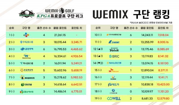 한장상 인비테이셔널에 참가한 CJ 소속 선수 4명 모두 톱10에 이름을 올리며 위믹스 구단 랭킹 2위 우리금융그룹과의 포인트 격차를 3245.71점으로 늘렸다.
