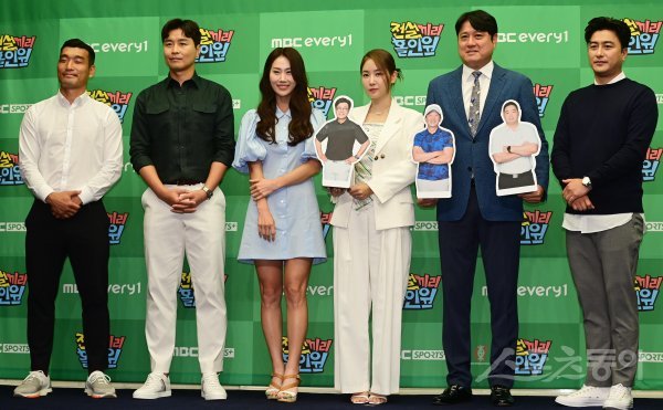 전 축구선수 조원희, 이동국, 프로골퍼 김하늘, 가수 소유, 전 농구감독 문경은, 방송인 안정환이 19일 서울 마포구 상암동 스탠포드호텔 서울에서 열린 MBC에브리원 ‘전설끼리 홀인원’ 제작발표회에서 포즈를 취하고 있다.
