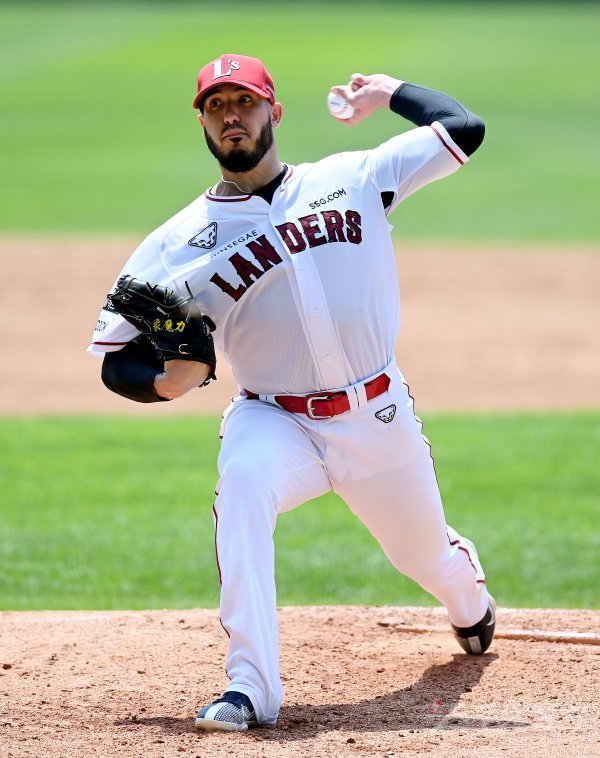 19일 인천 SSG 랜더스필드에서 SSG 랜더스와 파주 챌린저스의 연습경기가 열렸다. SSG 새 외국인 투수 모리만도가 힘차게 볼을 던지고 있다.