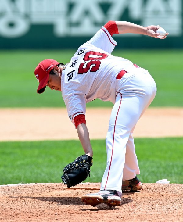 19일 인천 SSG 랜더스필드에서 SSG 랜더스와 파주 챌린저스의 연습경기가 열렸다. 부상에서 복귀한 SSG 박종훈이 6회부터 구원 등판해 힘차게 볼을 던지고 있다.