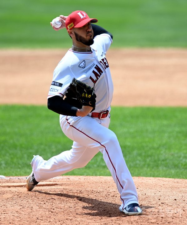 19일 인천 SSG 랜더스필드에서 SSG 랜더스와 파주 챌린저스의 연습경기가 열렸다. SSG 새 외국인 투수 모리만도가 힘차게 볼을 던지고 있다.