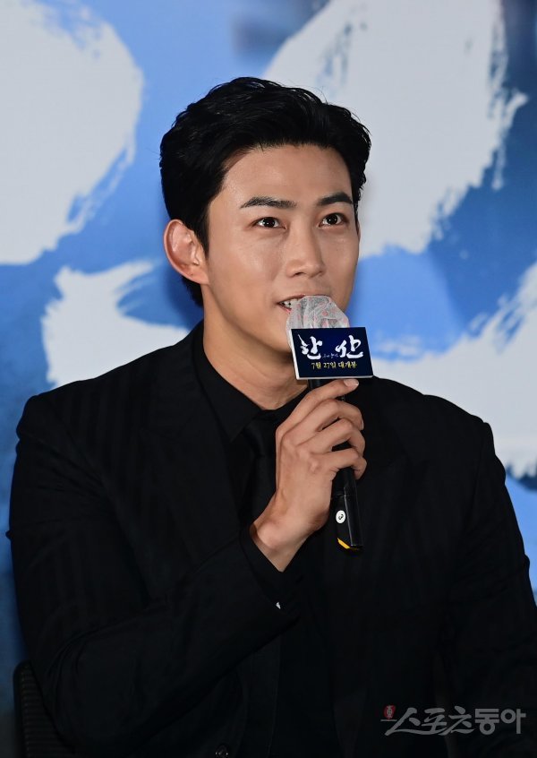 배우 옥택연이 19일 서울 송파구 신청동 롯데시네마 월드타워점에서 열린 영화 ‘한산: 용의 출현’ 언론시사회에서 인사말을 하고 있다.