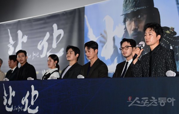 배우 박해일이 19일 서울 송파구 신천동 롯데시네마 월드타워점에서 열린 영화 ‘한산: 용의 출현’ 언론시사회에서 취재진의 질문에 답하고 있다.