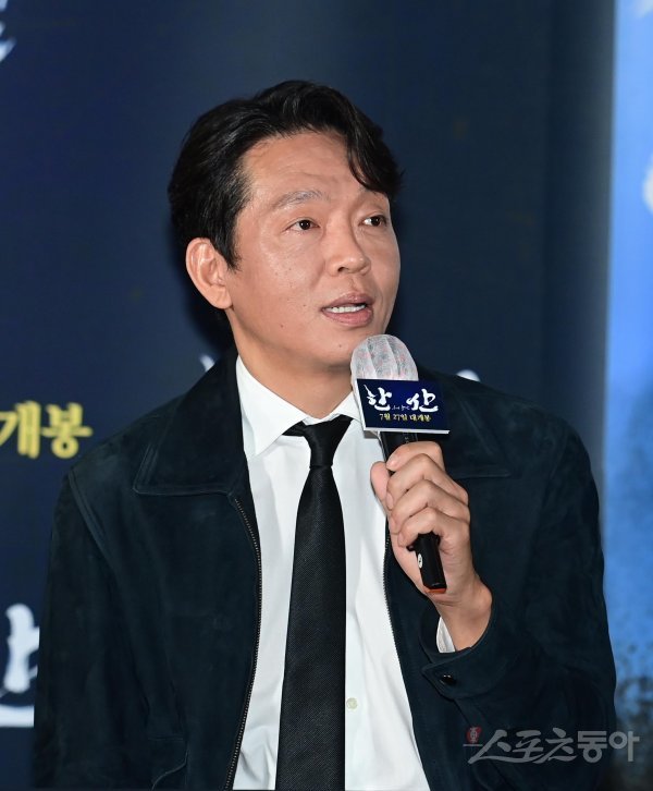 배우 박지환이 19일 서울 송파구 신천동 롯데시네마 월드타워점에서 열린 영화 ‘한산: 용의 출현’ 언론시사회에서 인사말을 하고 있다.
