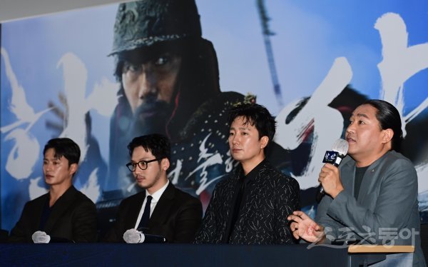 김한민 감독이 19일 서울 송파구 신천동 롯데시네마 월드타워점에서 열린 영화 ‘한산: 용의 출현’ 언론시사회에서 취재진의 질문에 답하고 있다.