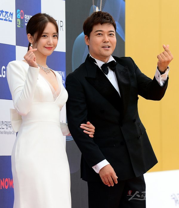 19일 인천 영종도 파라다이스시티에서 열린 ‘제 1회 청룡시리즈어워즈’에 참석한 임윤아와 전현무가 카메라를 향해 포즈를 취하고 있다.