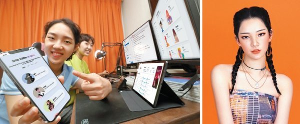 KT AI 보이스 스튜디오를 활용해 콘텐츠를 만들고 있는 어린이들(왼쪽)과 네이버 클로바 AI 음성합성 기술로 AI 보이스를 갖게 된 가상인간 로지. 사진제공|KT·네이버