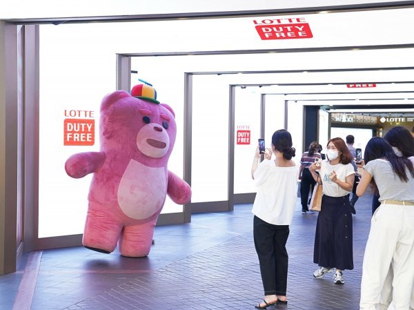 롯데면세점 이 여름휴가 시즌을 맞이해 해외여행을 준비하는 고객들을 위해 최근 큰 인기를 얻고 있는 분홍색 곰돌이 캐릭터 ‘벨리곰’의 팝업스토어를 21일부터 8월31일까지 운영한다. 벨리곰, 롯데홈쇼핑 사내 벤처 프로그램서 개발한 캐릭터