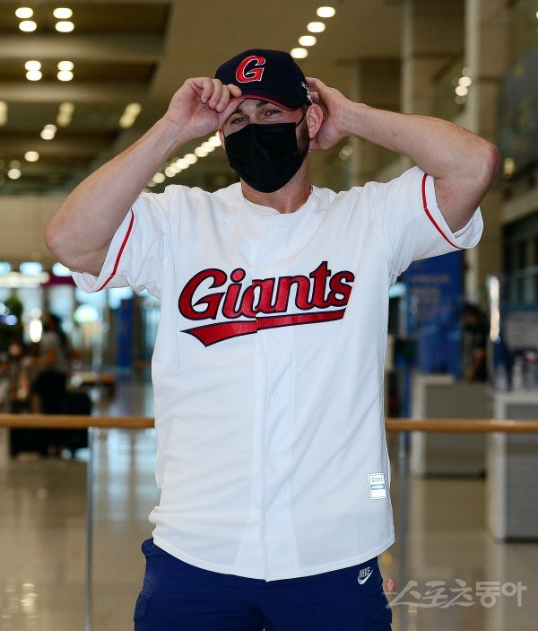 롯데 자이언츠 새 외국인 타자 잭 렉스가 21일 인천국제공항을 통해 입국해 카메라를 향해 포즈를 취하고 있다.