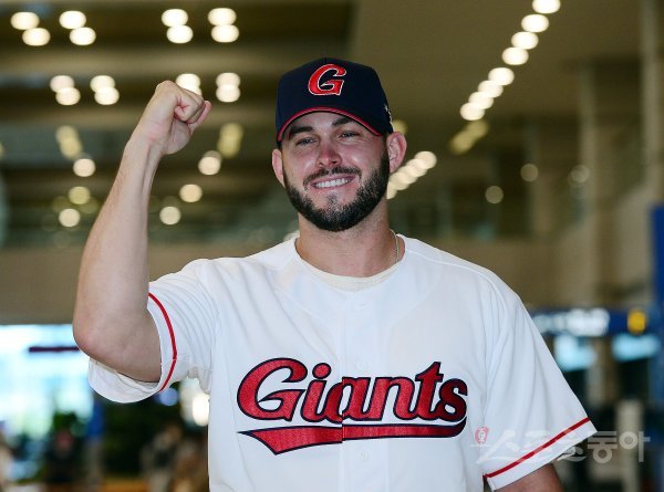 롯데 자이언츠 새 외국인 타자 잭 렉스가 21일 인천국제공항을 통해 입국해 카메라를 향해 포즈를 취하고 있다.