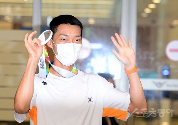 한국육상 최초로 세계육상선수권대회 높이뛰기 은메달을 차지한 우상혁이 21일 인천국제공항을 통해 귀국해 카메라를 향해 손을 흔들고 있다.