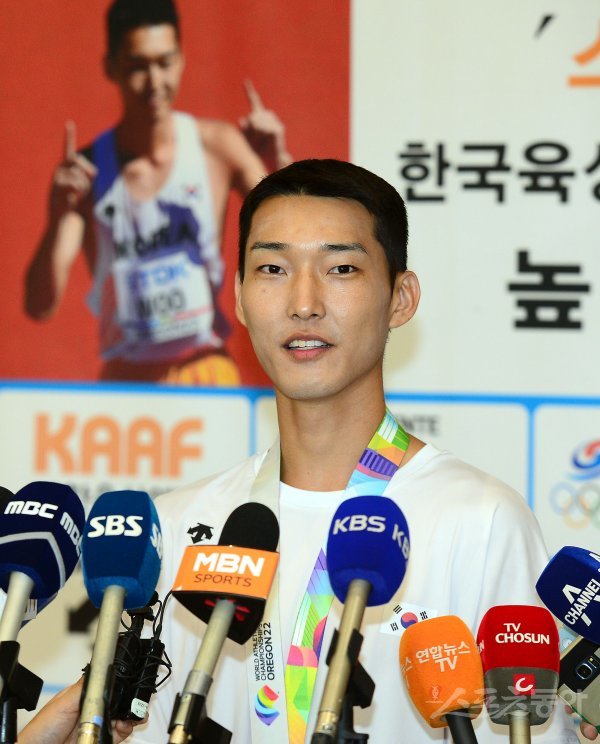 한국육상 최초로 세계육상선수권대회 높이뛰기 은메달을 차지한 우상혁이 21일 인천국제공항을 통해 귀국해 인터뷰를 하고 있다.
