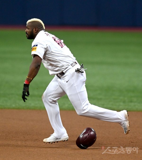 22일 고척스카돔에서 ‘2022 신한은행 MY CAR KBO리그’ 삼성 라이온즈와 키움 히어로즈 경기가 열렸다. 6회말 무사 키움 푸이그가 좌전 안타를 치고 2루로 달리다 넘어졌으나 다시 일어나 뛰고 있다.