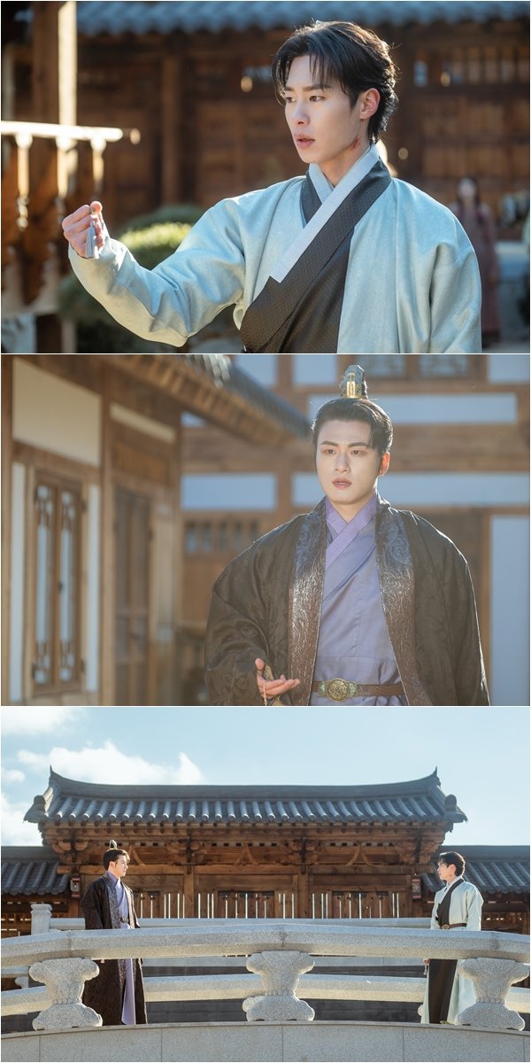tvN 토일드라마 ‘환혼’(연출 박준화/극본 홍정은 홍미란/제작 스튜디오드래곤 하이퀄리티) 측은 23일(토) 장씨 집안 장자 장욱(이재욱 분)과 세자 고원(신승호 분)의 다리 위 맞대면이 담긴 스틸을 소개했다.