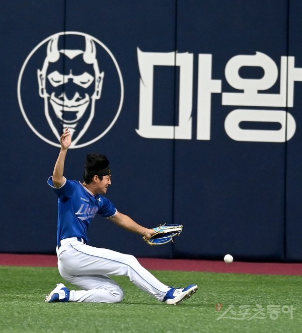 23일 고척스카돔에서 ‘2022 신한은행 MY CAR KBO리그’ 삼성 라이온즈와 키움 히어로즈 경기가 열렸다. 1회말 2사 1,3루 삼성 구자욱이 외야 뜬공을 다이빙캐치 시도했으나 놓치고 있다.