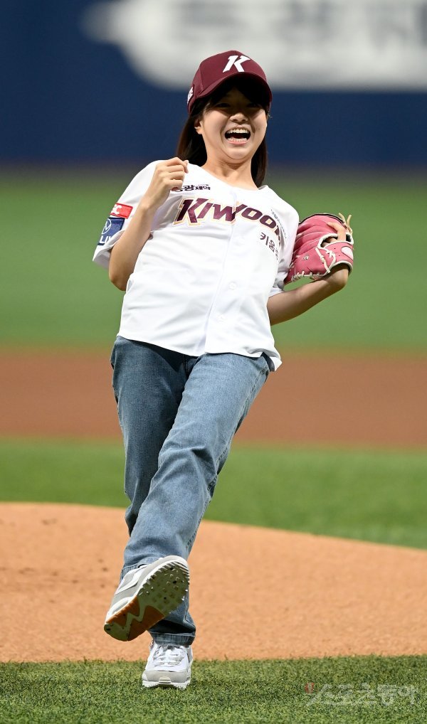 23일 고척스카돔에서 ‘2022 신한은행 MY CAR KBO리그’ 삼성 라이온즈와 키움 히어로즈 경기가 열렸다. 경기 전 가수 서기가 시구를 하고 있다.