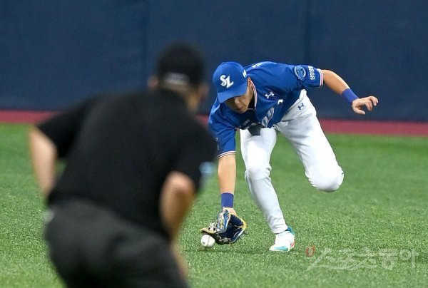 23일 고척스카돔에서 ‘2022 신한은행 MY CAR KBO리그’ 삼성 라이온즈와 키움 히어로즈 경기가 열렸다. 7회말 2사 3루 삼성 김현준이 외야 뜬공을 놓치고 있다.