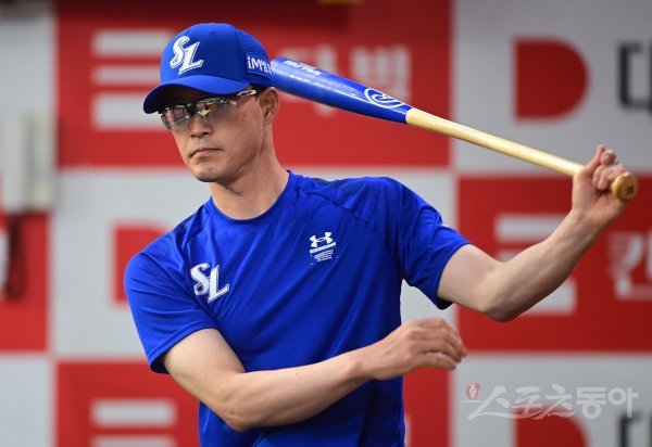 24일 서울 고척스카이돔에서 열린 ‘2022 신한은행 SOL KBO리그’ 키움 히어로즈와 삼성 라이온즈의 경기에 앞서 삼성 허삼영 감독이 더그아웃에서 스윙을 하고 있다.