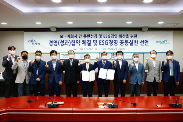 한국마사회(회장 정기환)는 한국마사회시설관리와 21일 과천 한국마사회 본관에서 모-자회사 경영협약, 경영성과협약, ESG경영 공동실천 선언을 동시에 진행했다. 정기환 한국마사회장을 비롯해 최원일 경영관리본부장과 한국마사회시설관리 윤각현 대표이사 및 임원진 등이 참석했다. 이번 행사는 6월 한국마사회시설관리 윤각현 대표이사의 취임에 맞춰 모, 자회사 간 경영방향 공유와 ESG 경영공동 실천을 위해 마련됐다.