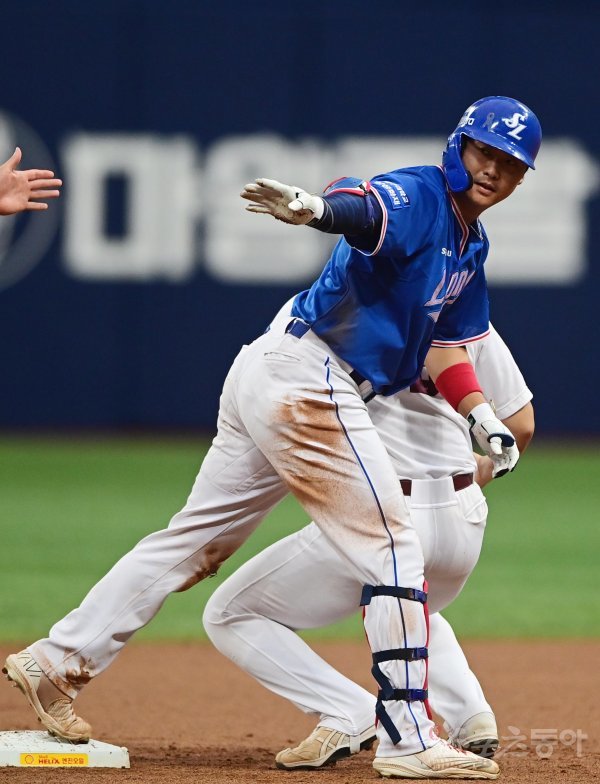 24일 서울 고척스카이돔에서 열린 ‘2022 신한은행 SOL KBO리그’ 키움 히어로즈와 삼성 라이온즈의 경기에서 2회초 1사 2루 삼성 김재성이 선제 1타점 우전 2루타를 친 후 심판에게 타임을 신청하고 있다.