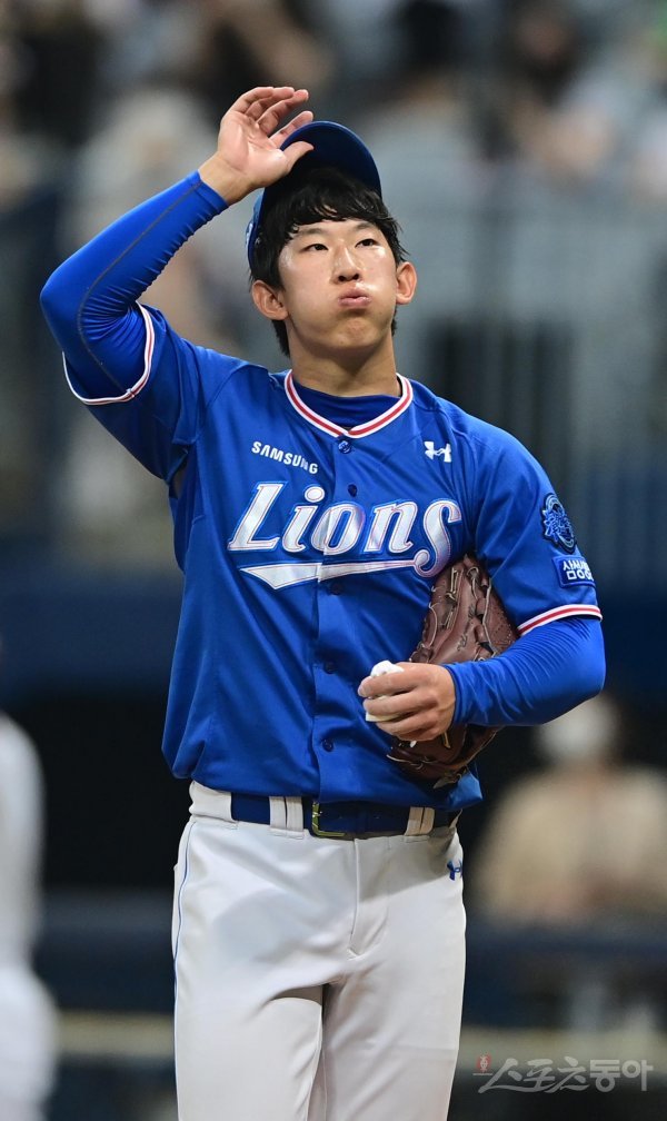 24일 서울 고척스카이돔에서 열린 ‘2022 신한은행 SOL KBO리그’ 키움 히어로즈와 삼성 라이온즈의 경기에서 3회말 수비를 마친 삼성 허윤동이 숨을 몰아쉬고 있다.