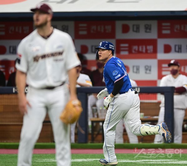 24일 서울 고척스카이돔에서 열린 ‘2022 신한은행 SOL KBO리그’ 키움 히어로즈와 삼성 라이온즈의 경기에서 5회초 2사 2루 삼성 오재일이 좌월 2점 홈런을 친 후 그라운드를 돌고 있다.