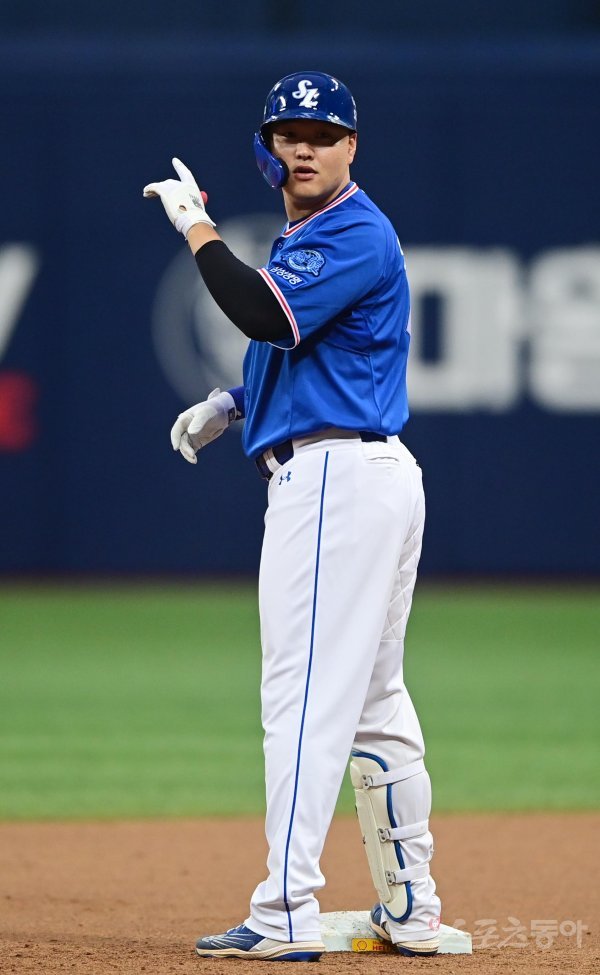 24일 서울 고척스카이돔에서 열린 ‘2022 신한은행 SOL KBO리그’ 키움 히어로즈와 삼성 라이온즈의 경기에서 6회초 2사 만루 삼성 오재일이 3타점 좌전 2루타를 친 후 더그아웃을 보고 있다.