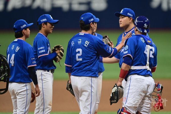 24일 서울 고척스카이돔에서 열린 ‘2022 신한은행 SOL KBO리그’ 키움 히어로즈와 삼성 라이온즈의 경기에서 키움에 8-0으로 승리한 삼성 오재일이 동료들과 기쁨을 나누고 있다.