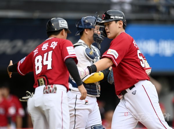 24일 서울 잠실야구장에서 ‘2022 신한은행 MY CAR KBO리그’ SSG 랜더스와 두산 베어스 경기가 열렸다. 2회초 2사 SSG 전의산이 우월 솔로 홈런을 날리고 그라운드를 돌아 홈인해 하이파이브 하고 있다.