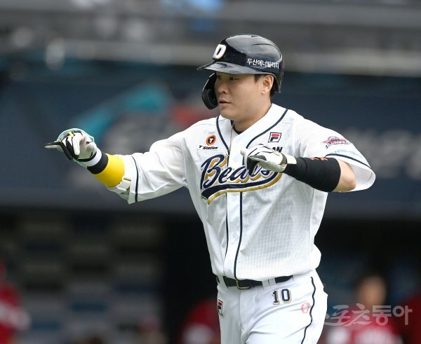 24일 서울 잠실야구장에서 ‘2022 신한은행 MY CAR KBO리그’ SSG 랜더스와 두산 베어스 경기가 열렸다. 1회말 2사 1루 두산 박세혁이 우월 투런 홈런을 날리고 그라운드를 돌아 홈인해 기뻐하고 있다.