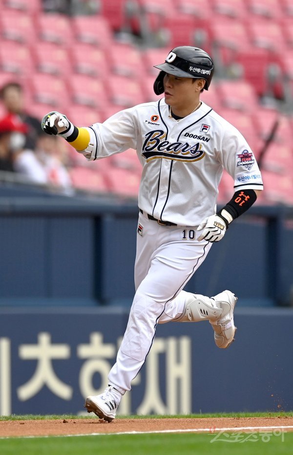 24일 서울 잠실야구장에서 ‘2022 신한은행 MY CAR KBO리그’ SSG 랜더스와 두산 베어스 경기가 열렸다. 1회말 2사 1루 두산 박세혁이 우월 투런 홈런을 날리고 그라운드를 돌며 하이파이브 하고 있다.