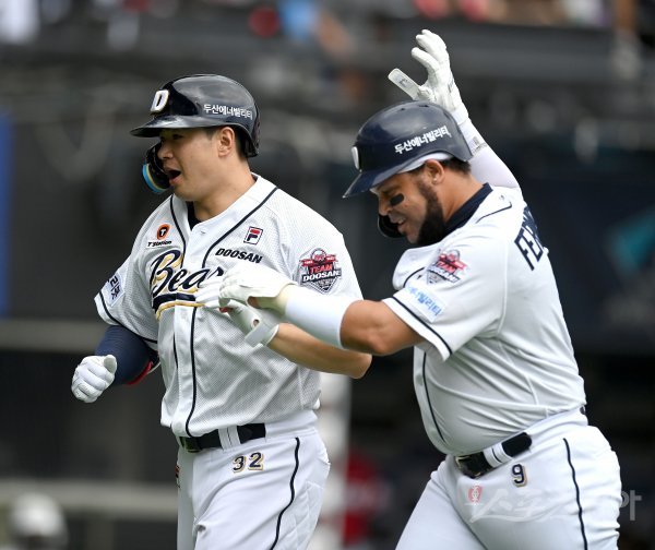 24일 서울 잠실야구장에서 ‘2022 신한은행 MY CAR KBO리그’ SSG 랜더스와 두산 베어스 경기가 열렸다. 1회말 2사 1루 두산 김재환이 우중월 투런 홈런을 날리고 그라운드를 돌아 홈인해 하이파이브 하고 있다.