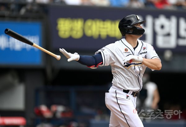 24일 서울 잠실야구장에서 ‘2022 신한은행 MY CAR KBO리그’ SSG 랜더스와 두산 베어스 경기가 열렸다. 1회말 2사 1루 두산 김재환이 우중월 투런 홈런을 날리고 있다.