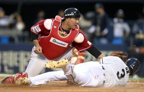 24일 서울 잠실야구장에서 ‘2022 신한은행 MY CAR KBO리그’ SSG 랜더스와 두산 베어스 경기가 열렸다. 6회말 2사 2루 두산 안타 때 2루주자 안재석이 홈까지 달렸으나 SSG 이재원에게 태그 아웃되고 있다.