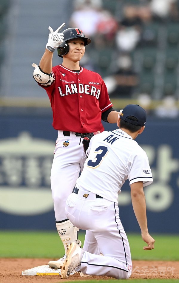 24일 서울 잠실야구장에서 ‘2022 신한은행 MY CAR KBO리그’ SSG 랜더스와 두산 베어스 경기가 열렸다. 5회초 2사 2,3루 SSG 박성한이 역전 2타점 적시타를 치고 공이 홈으로 송구되는 사이 2루까지 달려 세이프 된 후 기뻐하고 있다.