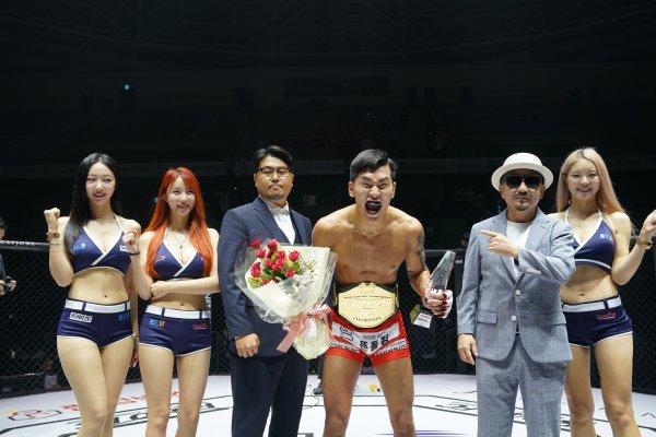 박시원(오른쪽 세 번째)이 23일 원주종합체육관에서 열린 굽네 로드FC 061 대회에서 라이트급 챔피언 등극 후 기념 사진을 촬영하고 있다. 사진 왼쪽부터 로드걸 신해리, 임지우, 로드FC 서덕호 대표, 박시원, 로드FC 박상민 부대표. 사진제공 | 로드FC