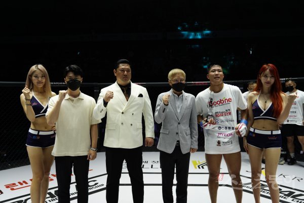 최지운(오른쪽 두 번째)이 23일 원주종합체육관에서 열린 굽네 로드FC 061 대회에서 승리 후 기념 사진을 촬영하고 있다. 사진 왼쪽부터 로드걸 서리나, 대명산업개발 박희준 대표, 합천모터스 유성재 대표, 대명산업개발 박우정 대표, 최지운, 로드걸 임지우.