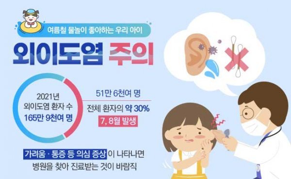 여름방학이 시작됐다. 요즘은 바다와 계곡, 수영장은 물론이고 워터파크부터 풀빌라까지 다양한 환경에서 물놀이를 즐길 수 있다. 여름철 물놀이 즐길 때 주의할 질환이 외이도염이다. 건강보험심사평가원(심평원) 통계에 따르면 2021년 외이도염으로 진료받은 환자는 165만9000여 명이다. 이중 약 30%인 51만6000여 명이 7, 8월에 발생했다.