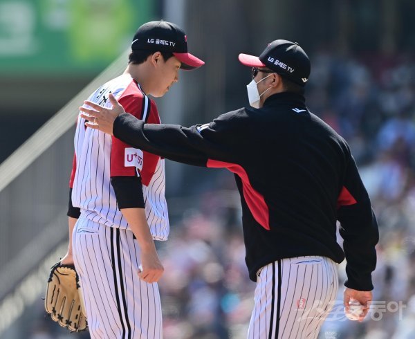올 시즌 LG 선발진의 평균자책점(ERA)은 4.04로 10개 구단 중 5위다. 하지만 외국인투수 케이시 켈리와 아담 플럿코의 ERA가 각각 2.24, 2.94임을 고려하면 국내 선발진의 ERA가 매우 높다는 것은 어렵지 않게 짐작할 수 있다. 이닝소화능력도 아쉽다. 임찬규는 12경기에서 50.2이닝을 던졌다. 이민호는 16경기에서 76.1이닝. 김윤식은 13경기에서 58.1이닝을 책임졌다. 경기당 5이닝 이상을 기록 중인 국내투수는 한 명도 없다.